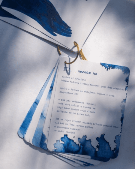 „Eliška kreslí barvami a Tereza slovy. Všechno vzniká za pohybu, v chaosu a v pozadí vyrůstají naše dvě děti – Ema a Šimon. Hodně pochybujeme a často si věci komplikujeme. Ale do toho všeho se velmi snažíme zvát Pána a prosit ho – jestli je ti naše dílo milé, použij si ho tak, jak potřebuješ. Vždyť Ty, narozený od nás, vidíš za tři rohy.“
