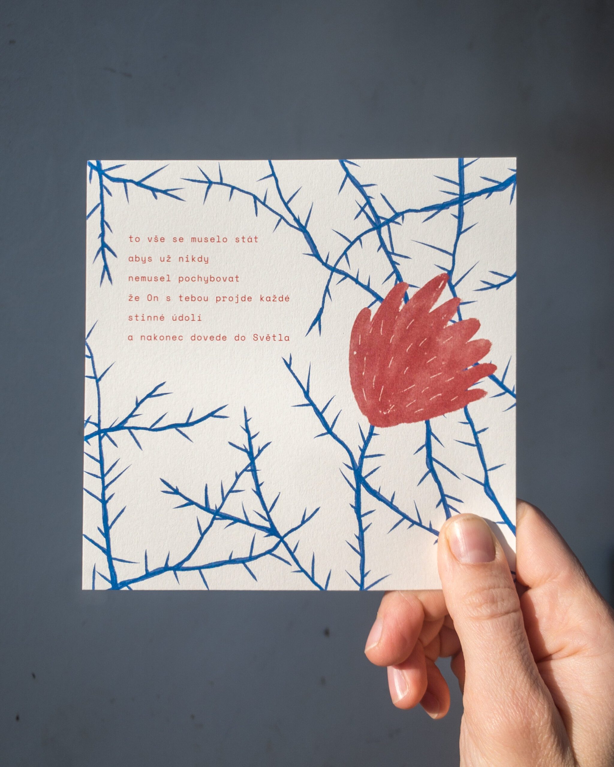 Čtvercová pohlednice (14,5×14,5 cm) je vytištěna na ekologickém neběleném grafickém papíru Munken Pure Rough 300g. Zadní strana je prázdná, jen s předtištěným řádkováním pro napsání adresy a prostorem pro nalepení poštovní známky.