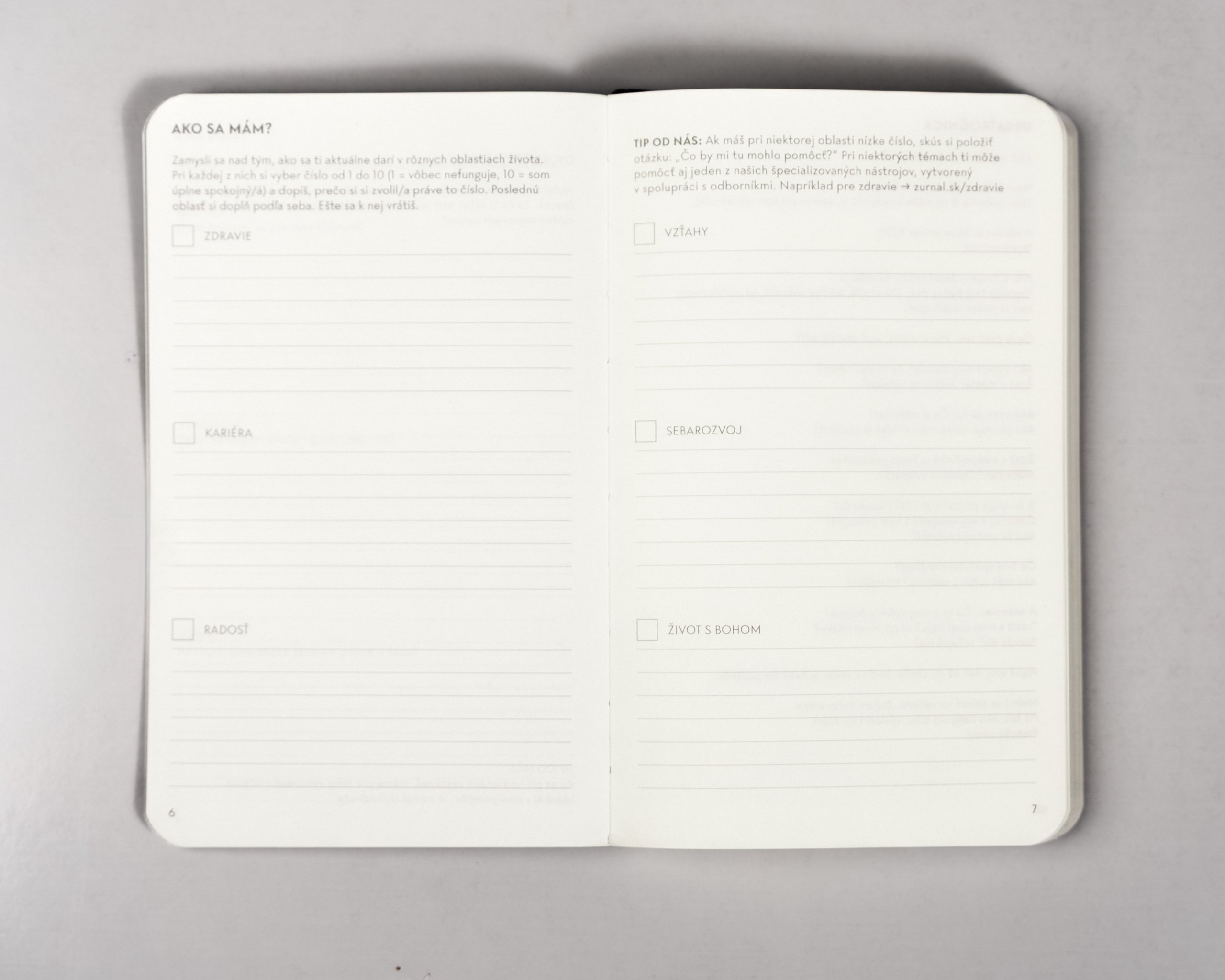 – každý týden: dvoustrana s prostorem pro poznámky na každý den, priorita týdne, místo pro vděčnost