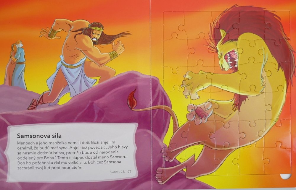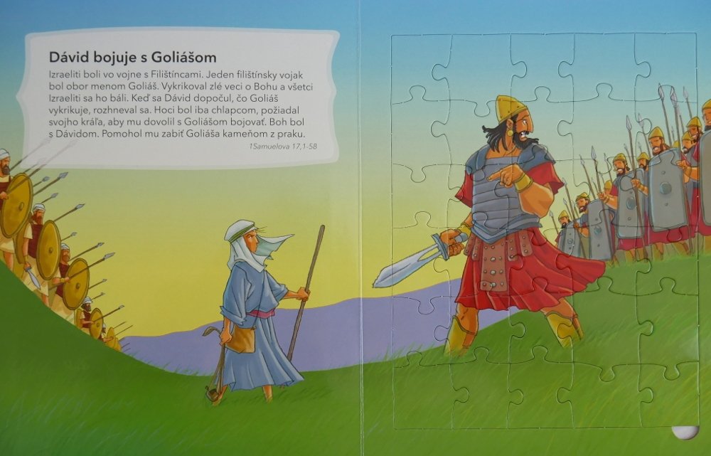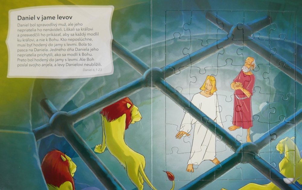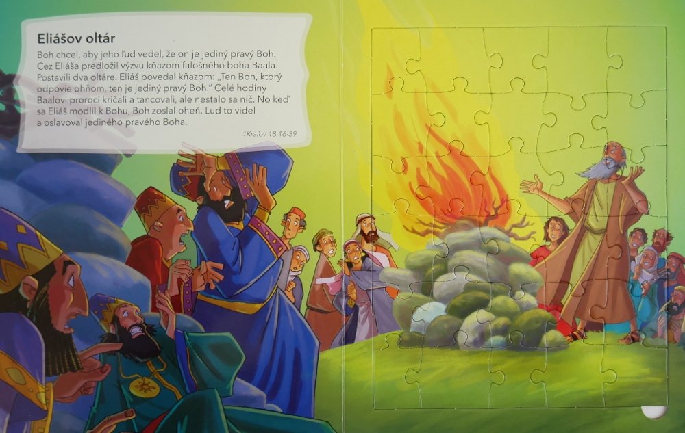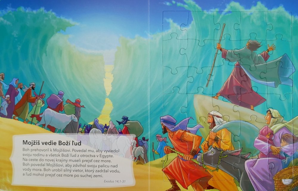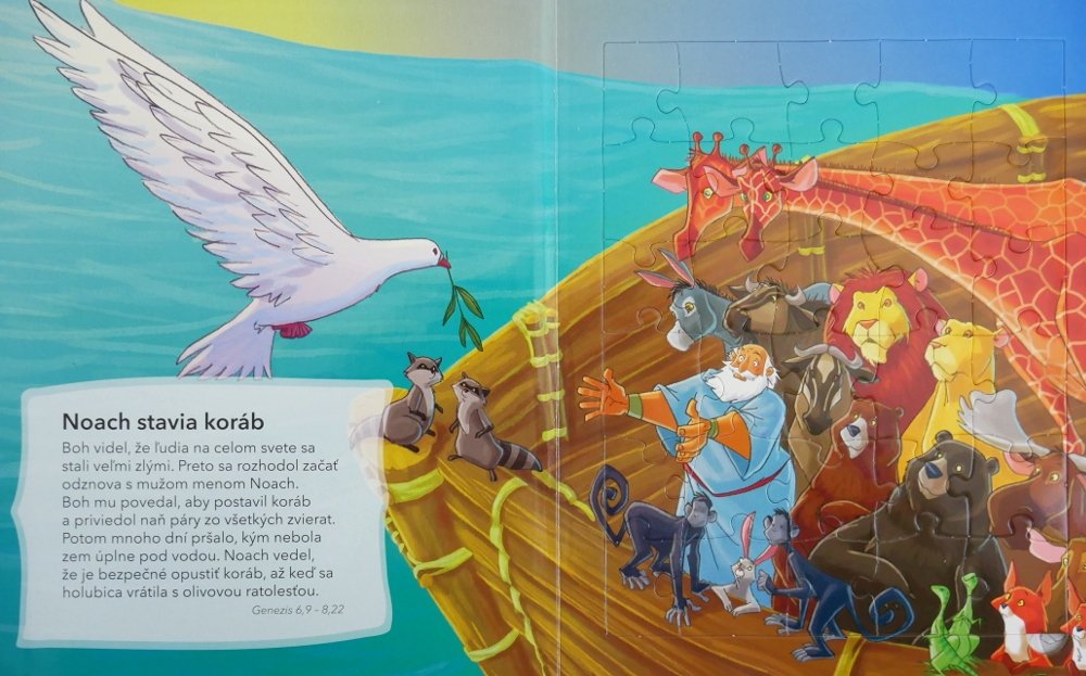 Můžete procházet nejoblíbenějšími biblickými příběhy Starého i Nového zákona, zatímco z nich bude vaše dítě skládat puzzle. Děti se tak mohou učit biblické pravdy a zároveň si zdokonalovat koordinaci rukou a očí, jemnou motoriku a logické řešení úloh.