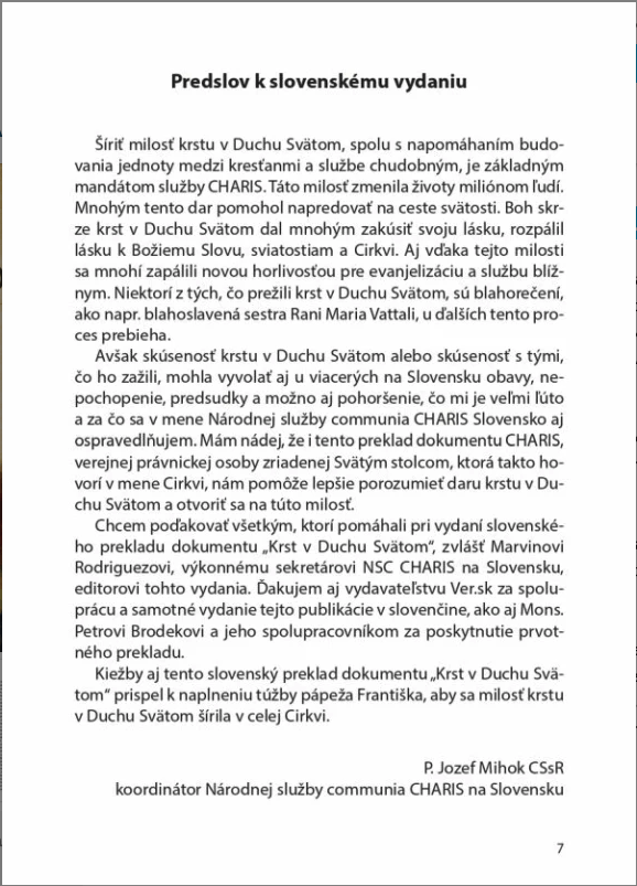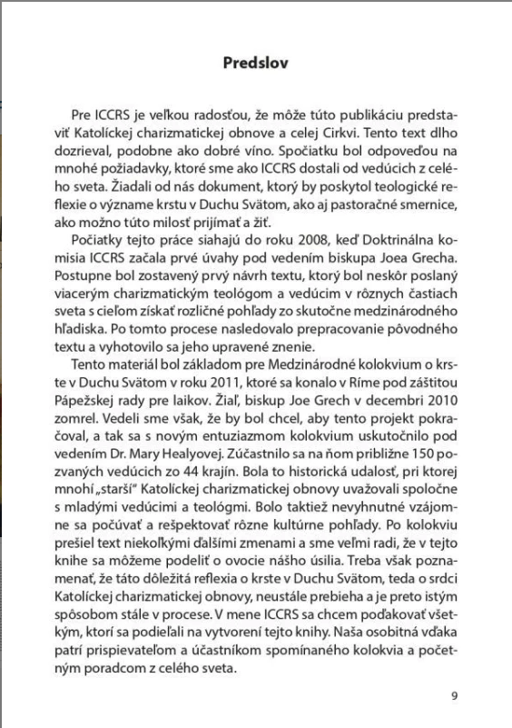 Srozumitelným způsobem se zde celé Církvi nabízí vynikající teologický rámec a silné pastorační směrnice pro pochopení, přijetí, službu a život křtu v Duchu Svatém – ústřední milosti Katolické charismatické obnovy.