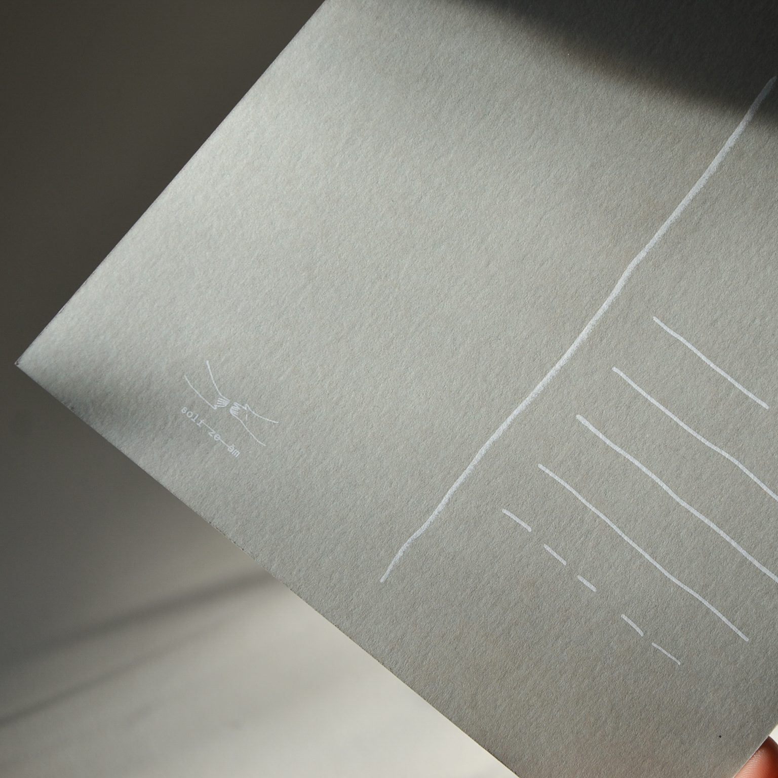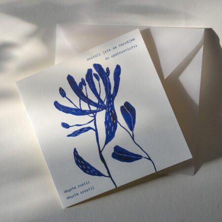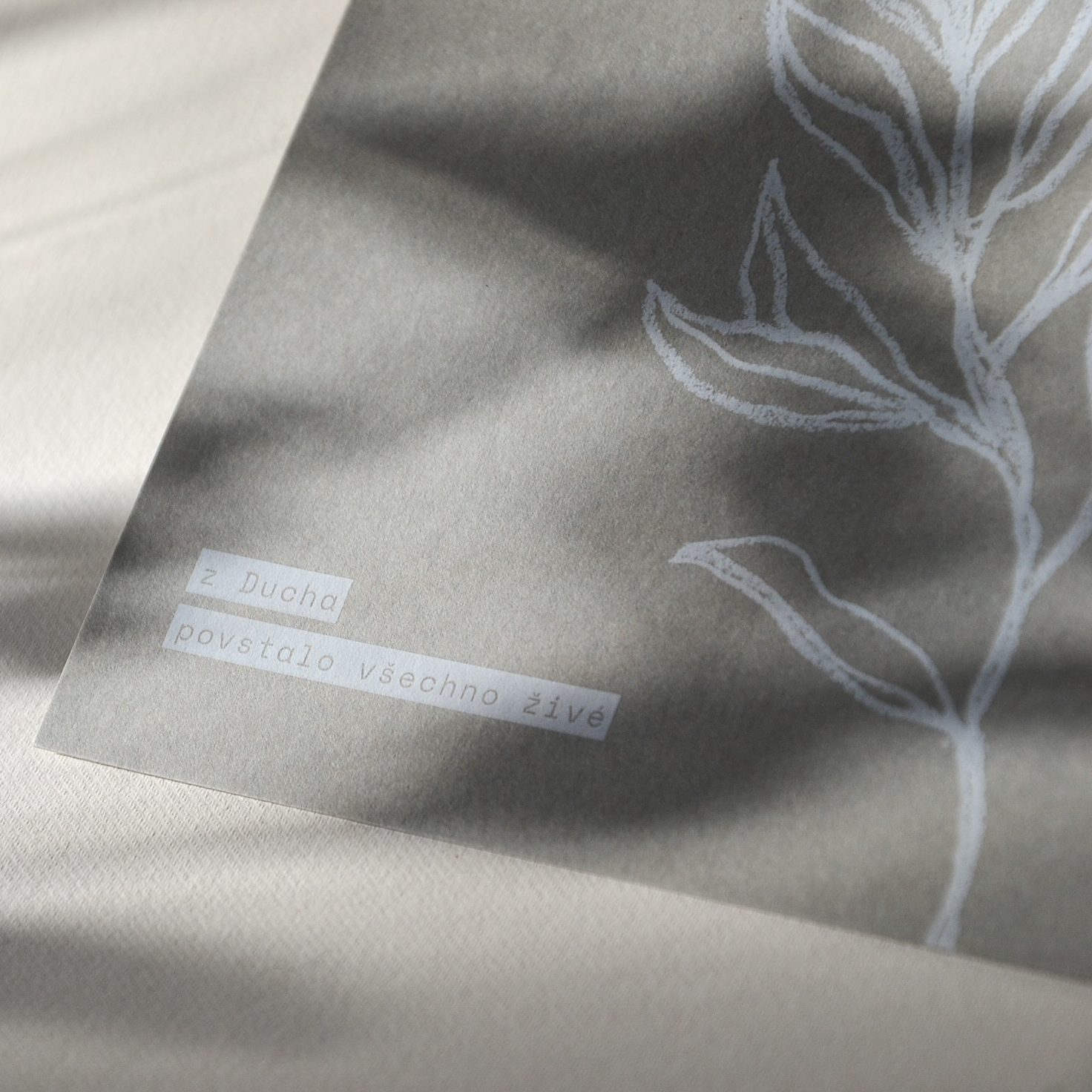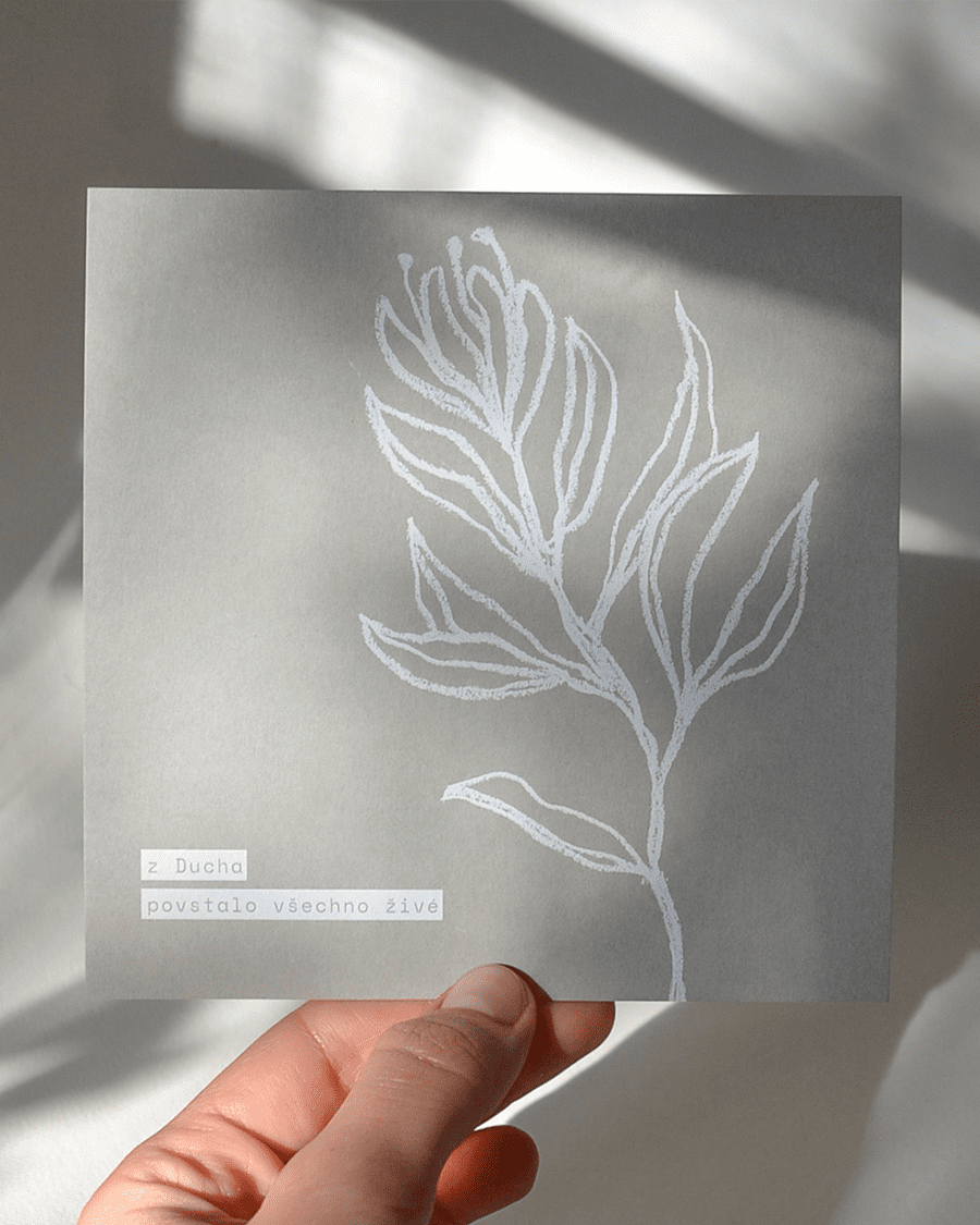 Čtvercová pohlednice (14,5 × 14,5 cm) je vytištěná na ekologickém grafickém papíru Keyakolour Lichen 300 g. Zadní strana je prázdná, pouze s předtištěným řádkováním pro napsání adresy a prostorem pro nalepení poštovní známky.