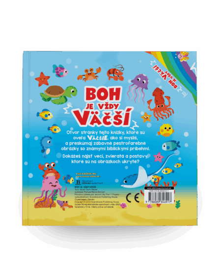 Otevři stránky této knížky, které jsou mnohem VĚTŠÍ, než si myslíš, a prozkoumej zábavné pestré obrázky se známými biblickými příběhy. Dokážeš najít věci, zvířata a postavy, které jsou na obrázcích ukryté?