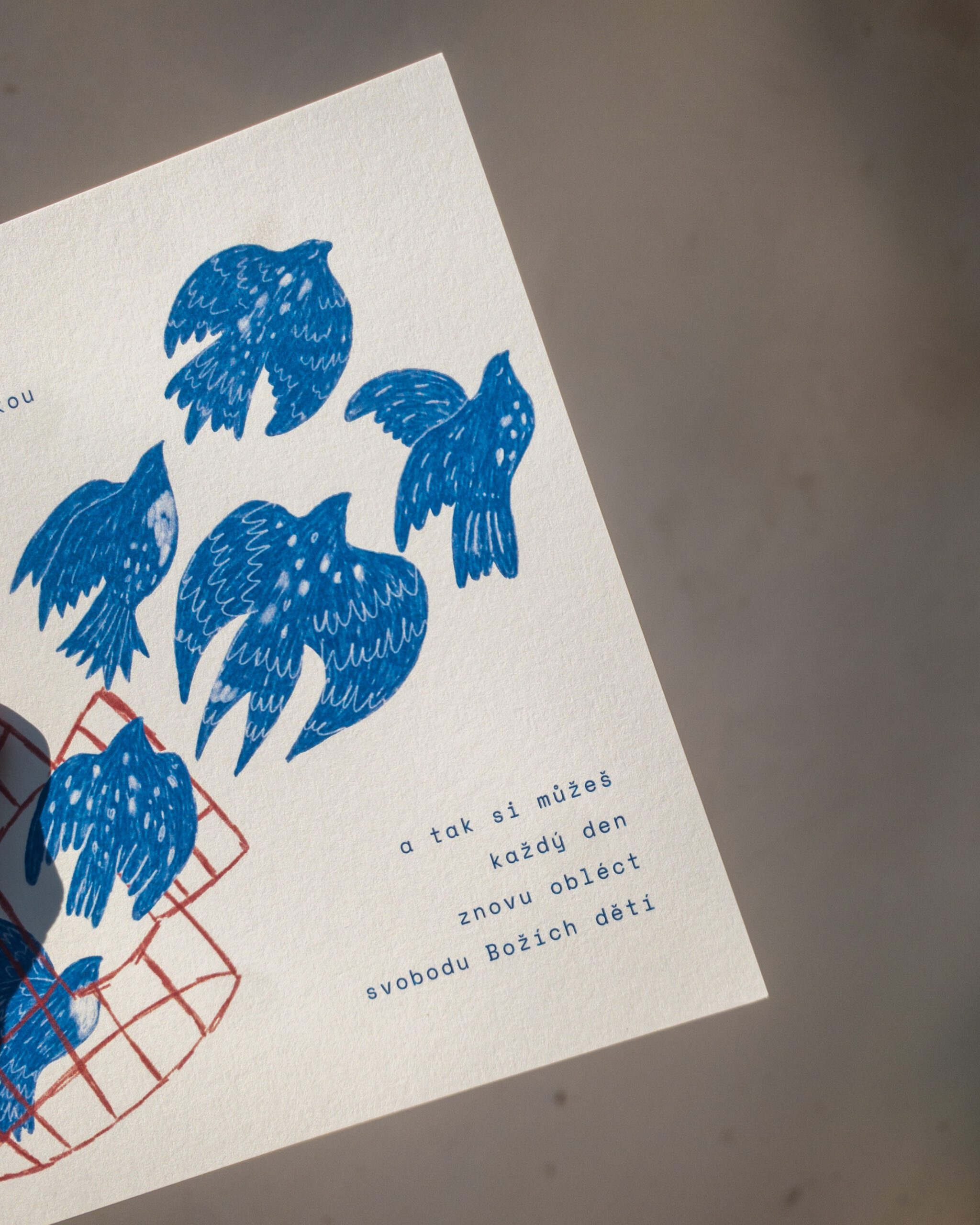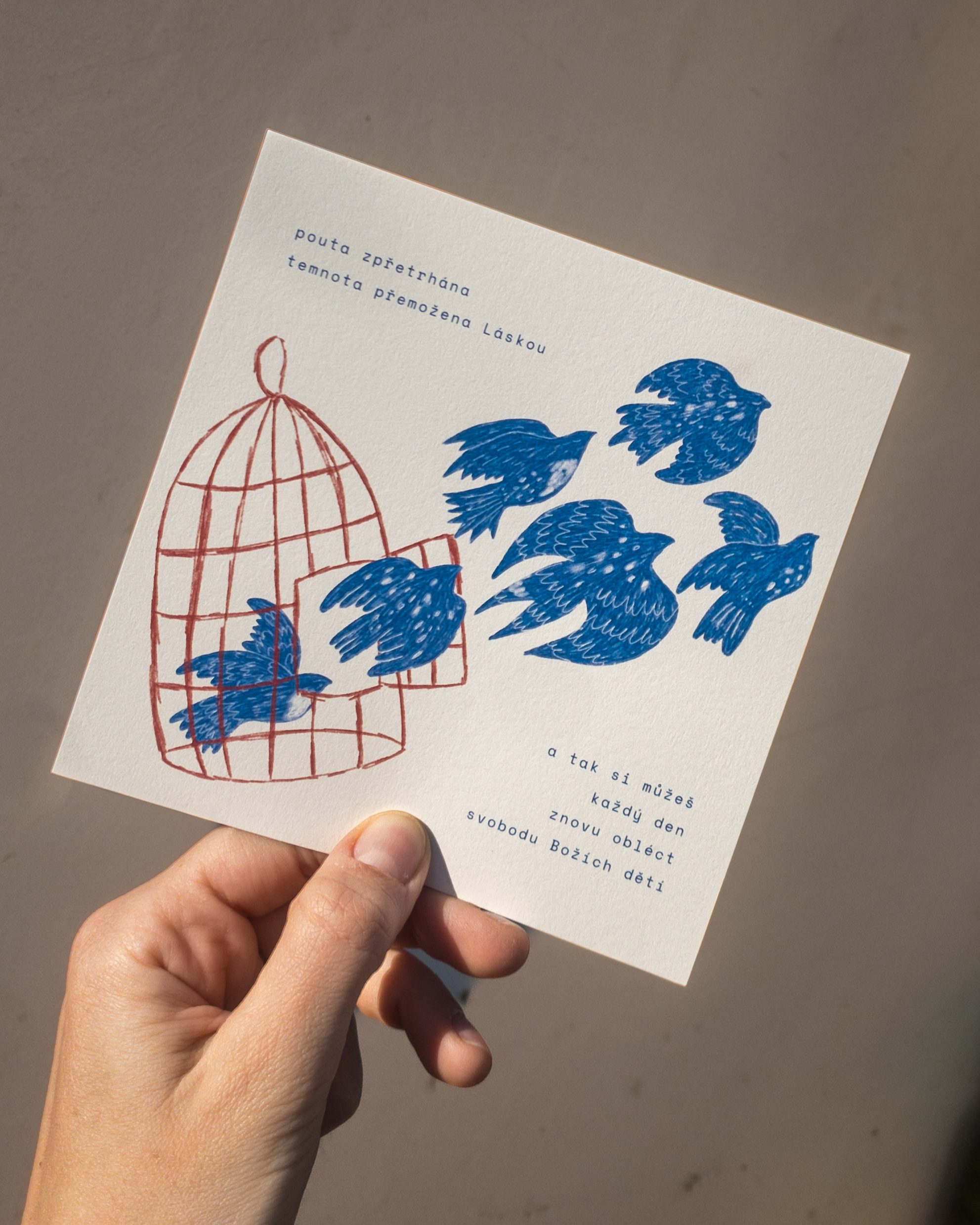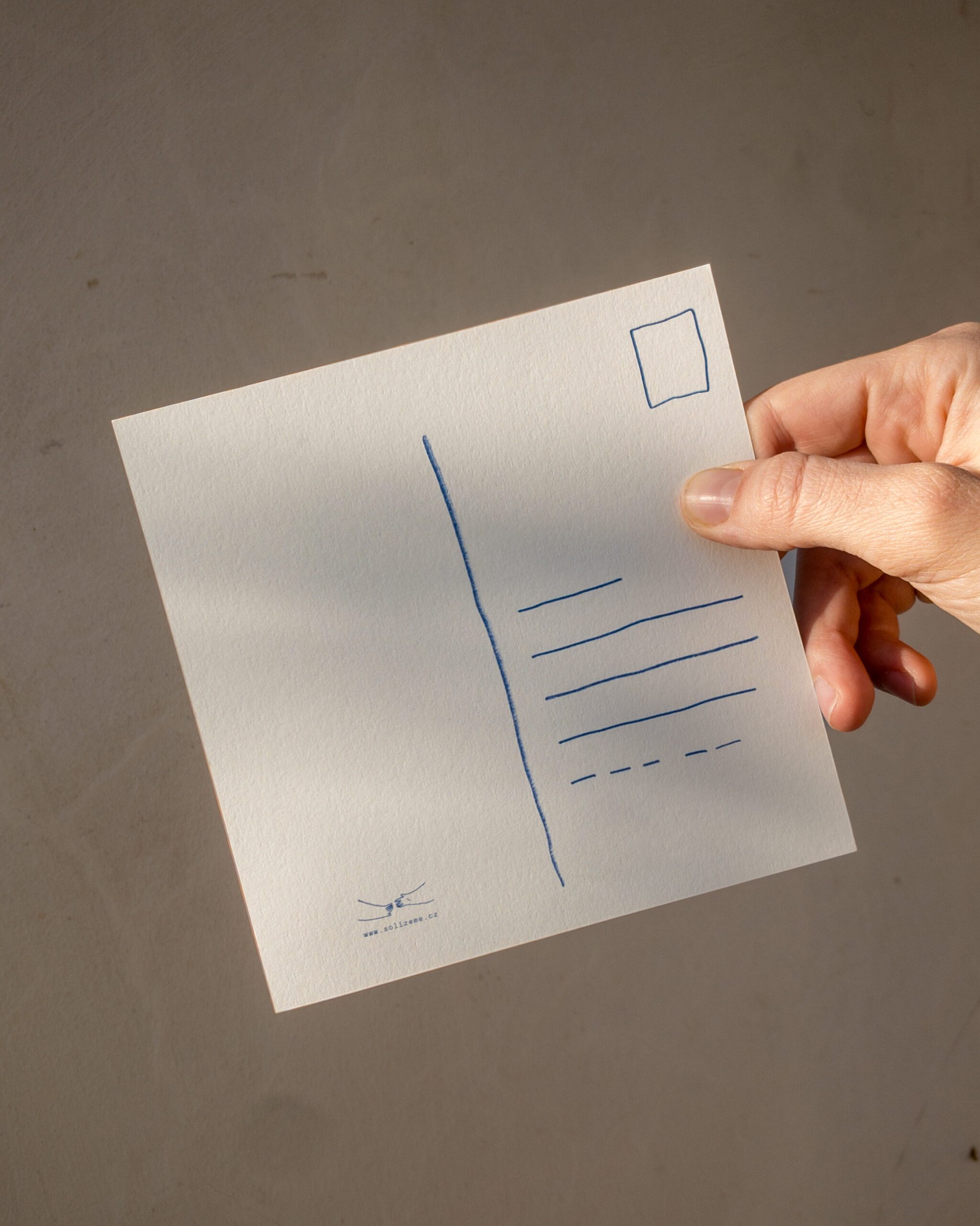 Čtvercová pohlednice (14,5×14,5 cm) je vytištěná na ekologickém neběleném grafickém papíru Munken Pure Rough 300g. Zadní strana je prázdná, jen s předtištěným řádkováním na napsání adresy a prostorem na nalepení poštovní známky.