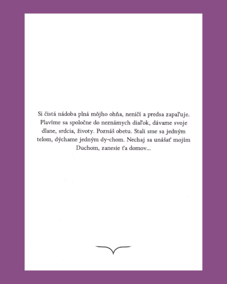 „Jsi čistá nádoba plná mého ohně, neničí a přesto zapaluje. Plujeme společně do neznámých dálek, dáváme své dlaně, srdce, životy. Znáš oběť. Stali jsme se jedním tělem, dýcháme jedním dechem. Nech se nést mým Duchem, zanese tě domů ..“